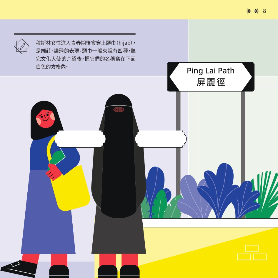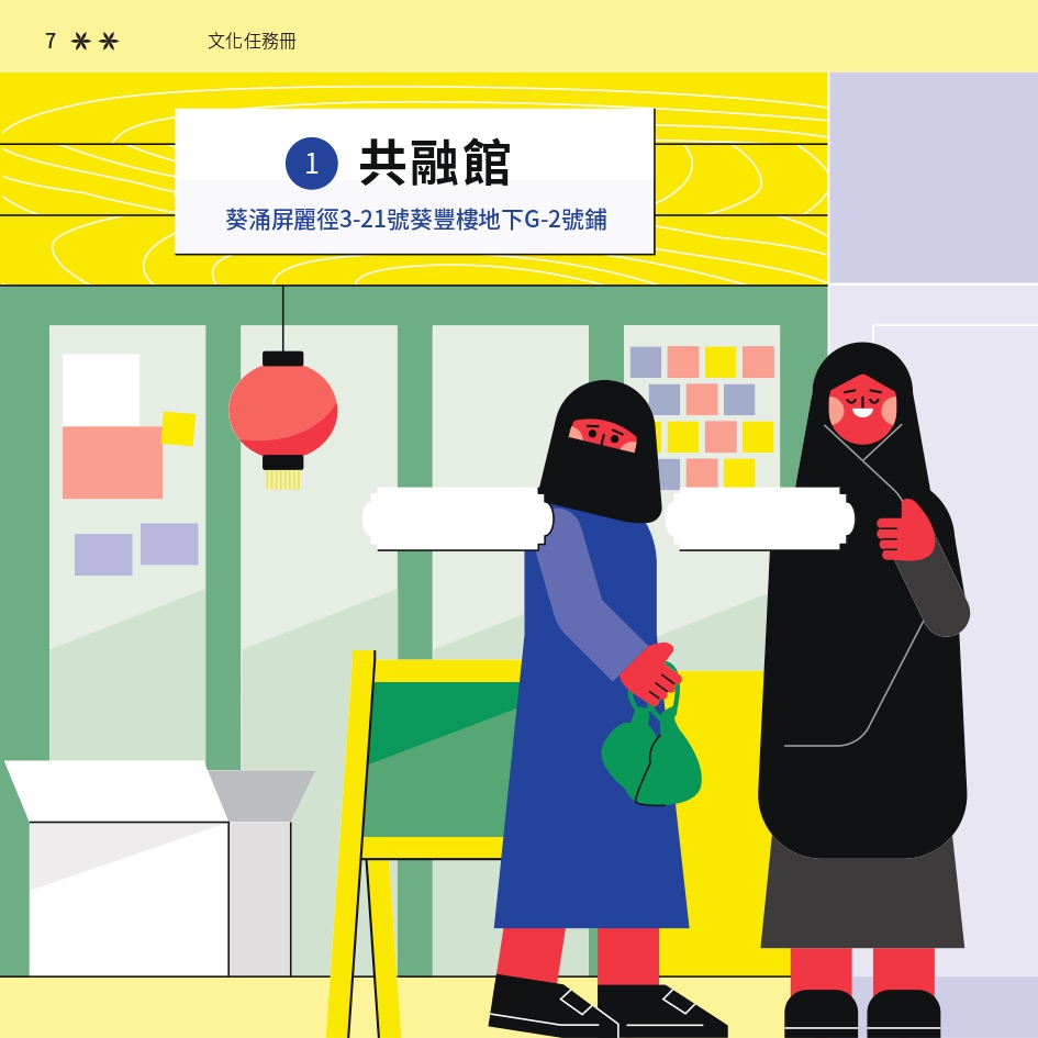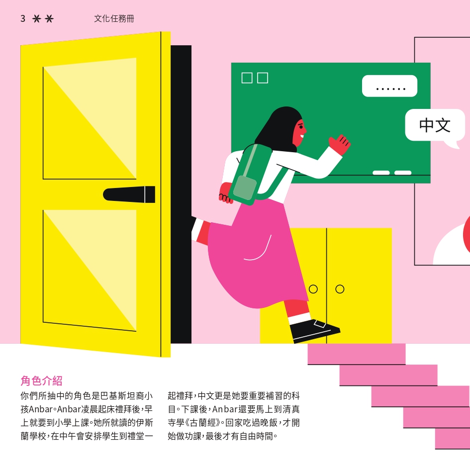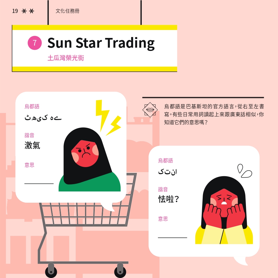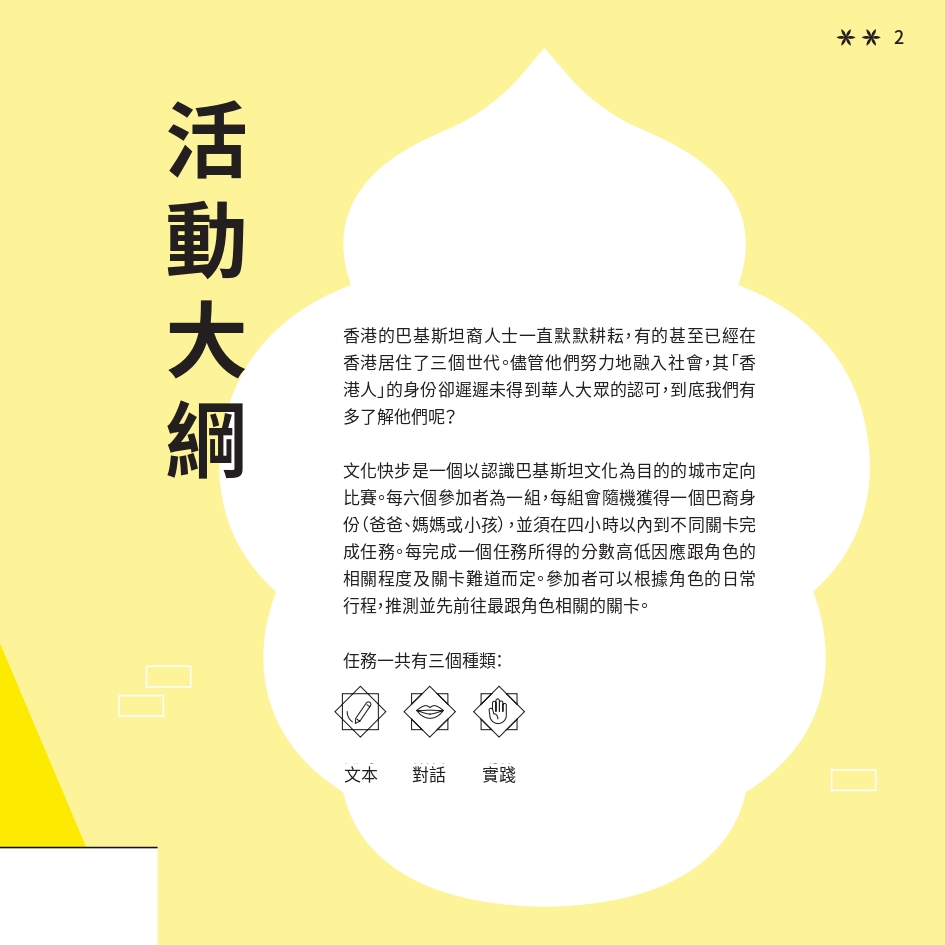 任務書採用了「文化快步」活動的視覺識別元素,用鮮明色彩與動感插畫營造活力。封面以 Risograph 印刷,當轉動輪盤,便能看到角色奔跑的效果,呼應活動主題。書本內頁有立體摺頁結構,重現在香港的巴基斯坦特色文化地點。