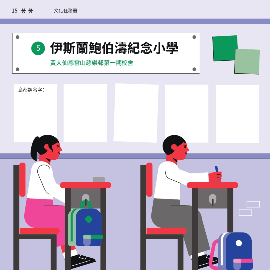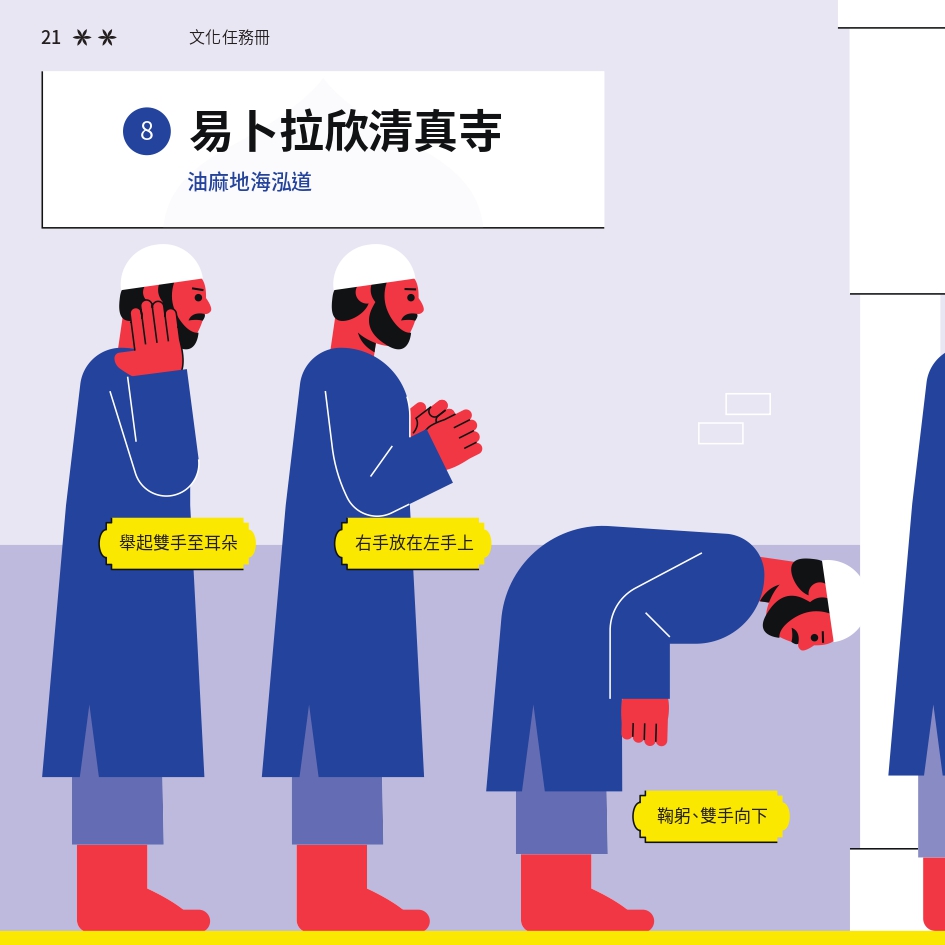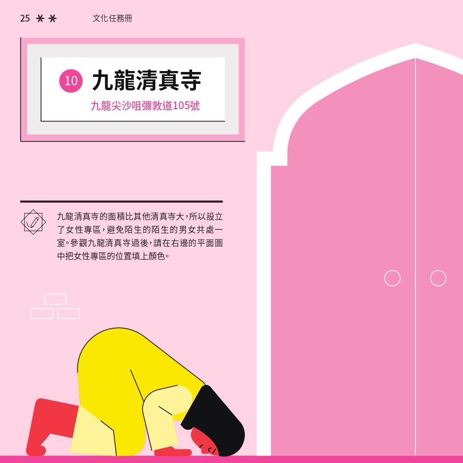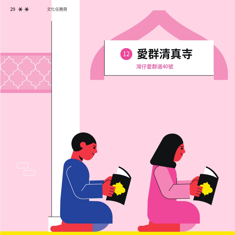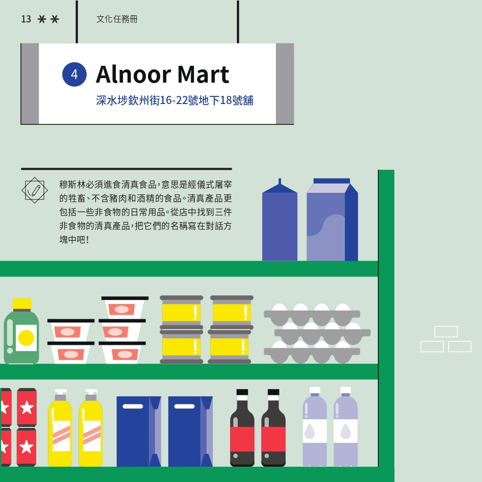 任務書採用了「文化快步」活動的視覺識別元素,用鮮明色彩與動感插畫營造活力。封面以 Risograph 印刷,當轉動輪盤,便能看到角色奔跑的效果,呼應活動主題。書本內頁有立體摺頁結構,重現在香港的巴基斯坦特色文化地點。