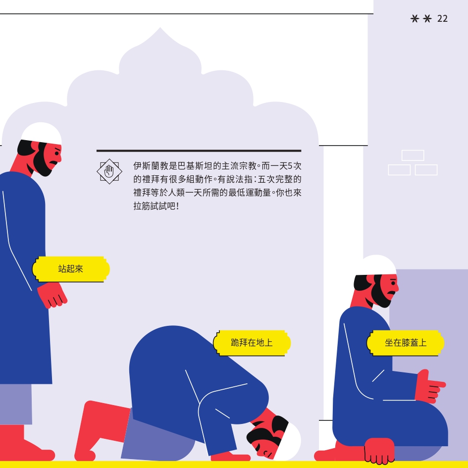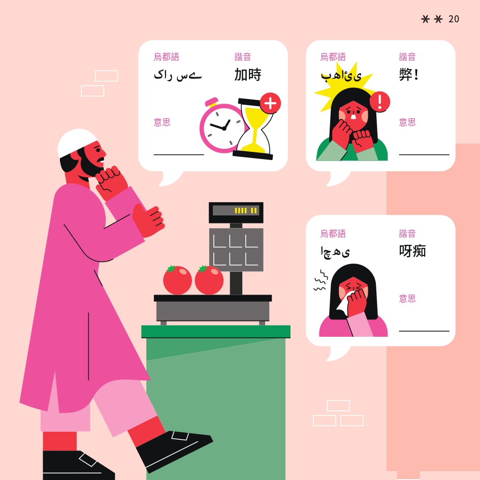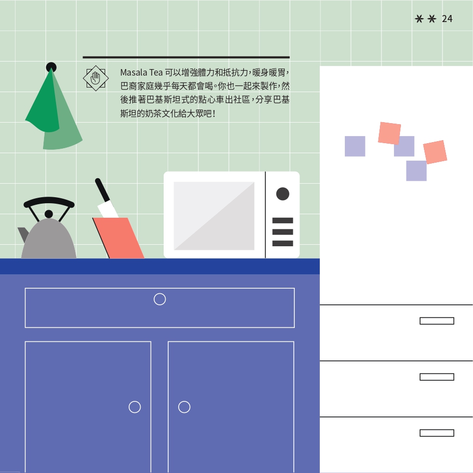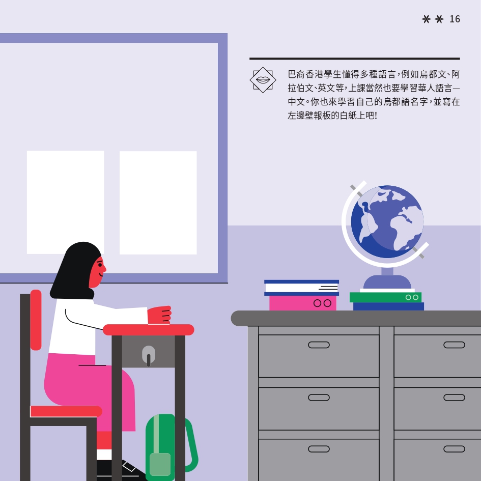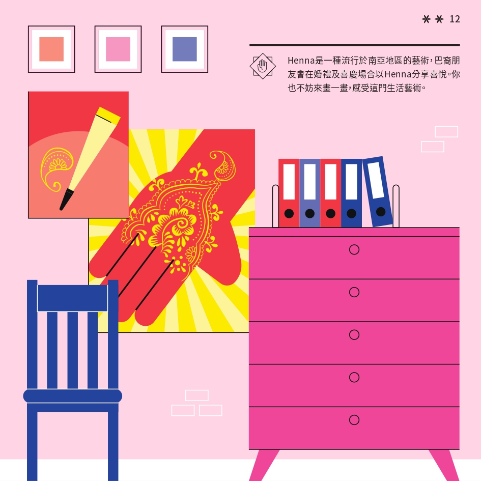 任務書採用了「文化快步」活動的視覺識別元素,用鮮明色彩與動感插畫營造活力。封面以 Risograph 印刷,當轉動輪盤,便能看到角色奔跑的效果,呼應活動主題。書本內頁有立體摺頁結構,重現在香港的巴基斯坦特色文化地點。
